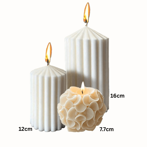 Enhance the ambiance of any space with our luxurious designer Candles. Heights 15cm, 10cm and 8cm creates an inviting atmosphere with its warm glow and elegant design. Perfect for home decor or special occasions.
