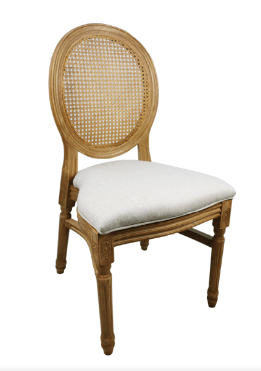 Louis Rattan Back Chair Resin with padded seat Resin dining chair with a round back and a light beige seat. Perfect for a formal or casual dining setting